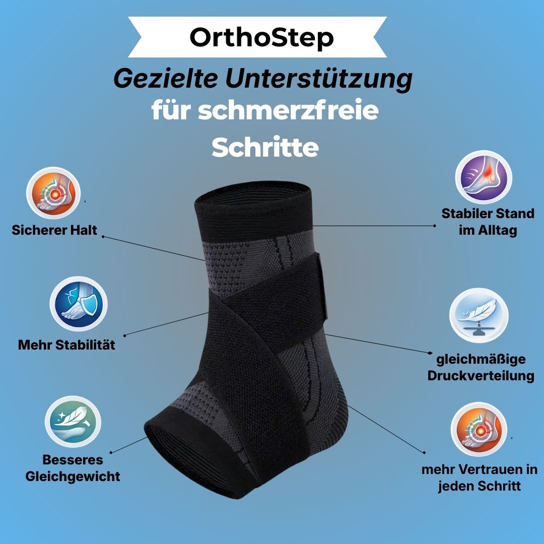 OrthoStep ist eine hochwertige, verstellbare Fuß- und Sprunggelenkbandage zur gezielten Entlastung und Stabilisierung bei Fußbeschwerden. Sie wurde speziell entwickelt, um das Fußgewölbe zu unterstützen, Druck von schmerzempfindlichen Bereichen zu nehmen und das Sprunggelenk zuverlässig zu stabilisieren – ideal bei Plantarfasziitis, Fersensporn oder Achillessehnenreizungen.