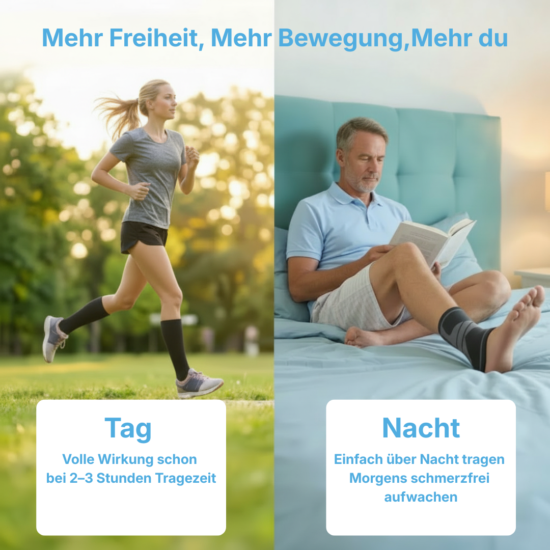 Dein Vorteil: Du bestimmst, wann dein Fuß Hilfe braucht – ganz ohne Arzttermin, ohne Wartezeit und ohne Medikamente. Einfach anziehen, losgehen und den Unterschied spüren.